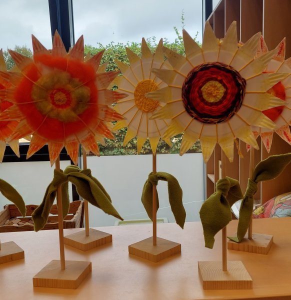 Vielleicht bieten Ihnen die in der Textil-AG entstandenen Herbstblumen ein wenig Anregung für gemeinsame Bastelarbeiten mit Ihren Kindern. Vielfältige Bastelmaterialien findet man derzeit in der Natur. Fragen Sie Ihre Kinder!