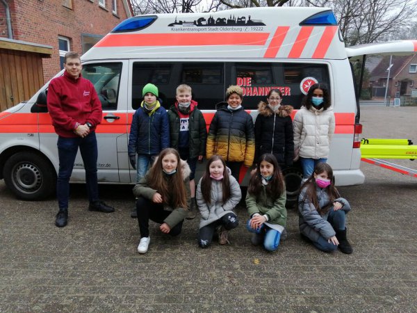 Unsere frisch ausgebildeten Schulsanitäterinnen und Schulsanitäter aus dem 4. Jahrgang helfen in den Pausen allen Kindern, die sich verletzt haben. An den Sanitätsdienstwesten sind sie schnell zu erkennen.