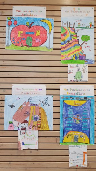 Die Klasse 2a ist zunächst in einer Fantasiereise durch ein wunderschönes buntes Tor in eine unglaubliche Stadt gereist. In dieser Stadt darf jeder sich sein Traumhaus so bauen, wie er es sich vorstellt. Die Kinder tauschten ihre Vorstellungen aus und malten dann ihr eigenes Traumhaus. Es ist eine kunterbunte Stadt mit wunderschönen Phantasiehäusern entstanden. Viele Kinder haben den Häusern neue Formen gegeben, die sie aus ihrem Umfeld kennen. Wer möchte, kann sich die Werke der kleinen Künstler im Forum ansehen.