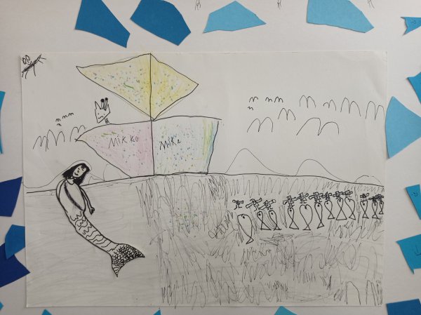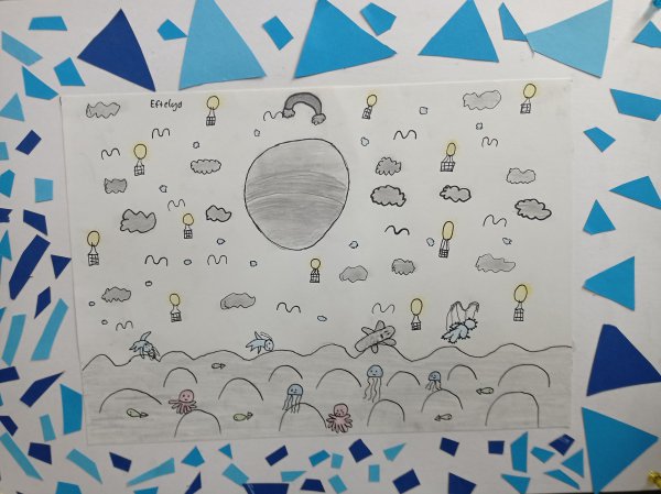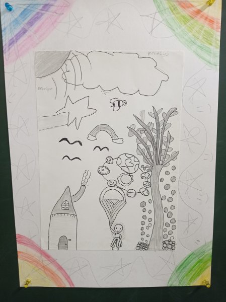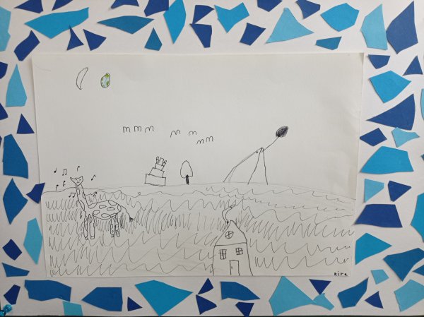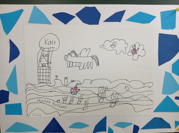 Nachdem die Kinder aus den 2. und 3. Klassen das Werk gemeinsam mit der Kunstpädagogin Heike Seiferth betrachtet haben, sind viele eigene Ideen entstanden. Es ging um Dinge im Bild, die nicht zusammenpassen (eine surreale Bildkomposition). Mit viel Phantasie haben die Kinder eigene Zeichnungen angefertigt und die Werke noch mit einem Rahmen versehen.